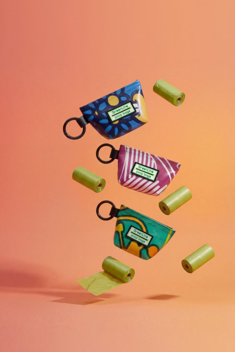 We save plastic festival banners destined for landfills and transform them into pouches for your poop bags. Each Banner Bag is one-of-a-kind and handmade in Chicago.