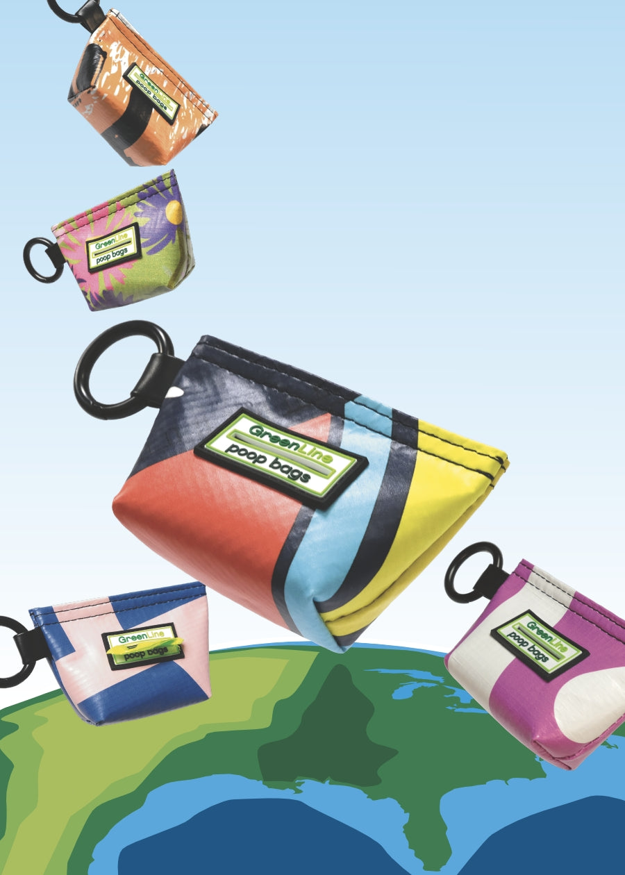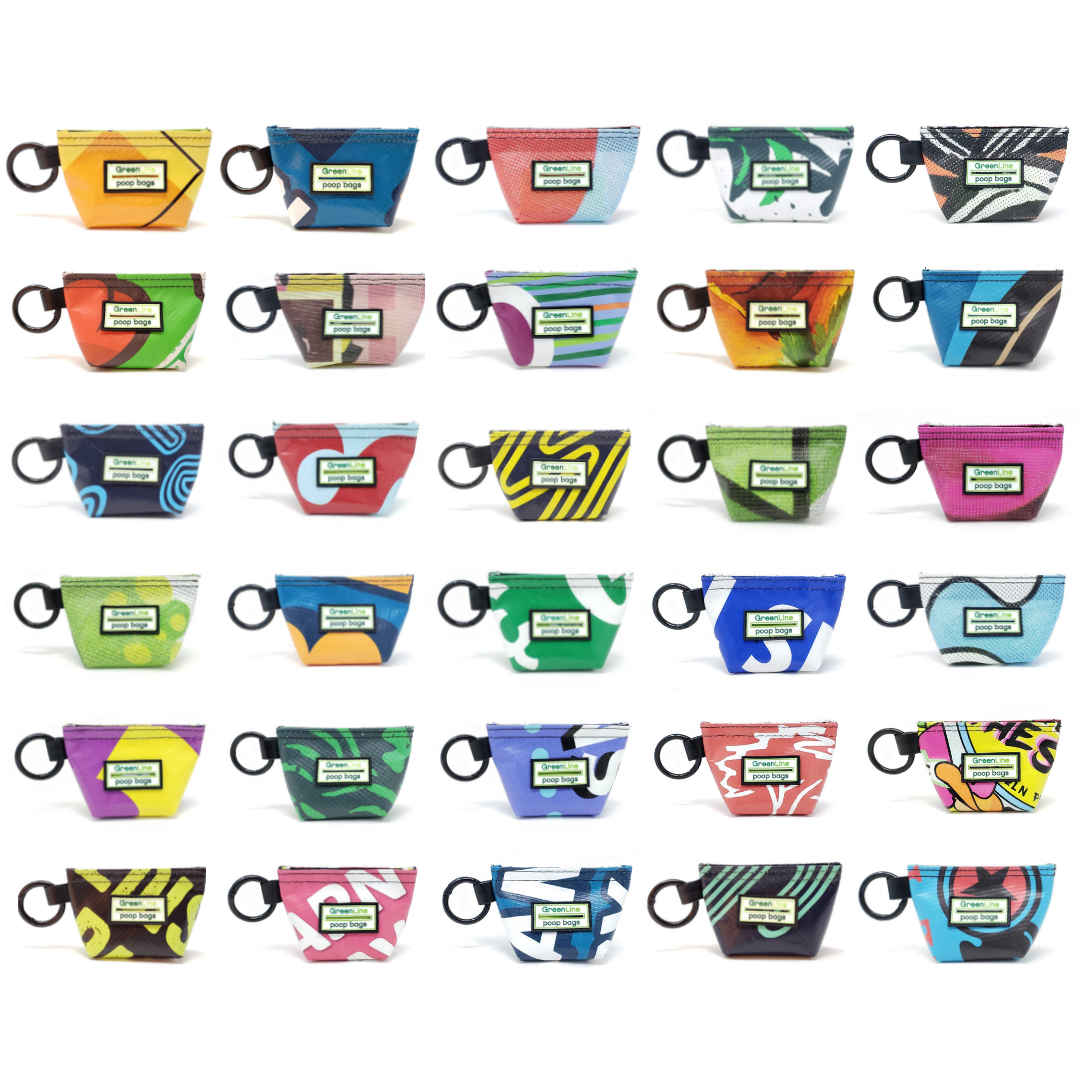 We save plastic festival banners destined for landfills and transform them into pouches for your poop bags. Each Banner Bag is one-of-a-kind and handmade in Chicago.