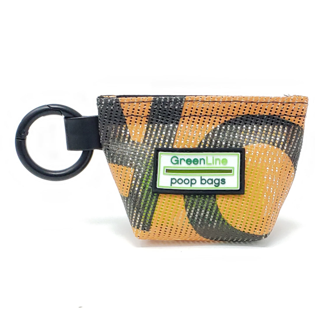 This bag has a story. It was a banner, discarded after a street festival, destined for a landfill. Now, this one-of-a-kind bag is ready for new adventures with you and your dog, picking up poop and protecting the planet.